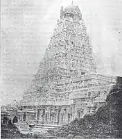 As per inscriptions found in the south wall of the temple, the shrine was constructed by the Chola king Kulothunga Chola III as a memorial of his successful North Indian campaign.[5] The inscriptions indicate the contribution towards the construction of the Nataraja shrine and the mukhamandapa. Some of the other temples that figure in the inscriptions are the Nataraja temple in Chidambaram, the Ekambareswarar temple at Kanchipuram, the Meenakshi temple at Madurai, the Mahalingeswarar Temple at Thiruvidamaruthur and the Brihadisvara Temple at Thanjavur.[6] The inscriptions in the shrine of the presiding deity is similar to the one in the outer gopuram (gateway tower), which indicates the building of the temple by Kulottunga-Choladeva. While it is unclear which Kulottunga it is, scholars have placed it at 1176 CE, which is closer to the reign of Kulothunga Chola III, who is believed to have been the last powerful Chola king. There are four inscriptions from Kulothunga Chola in Grantha script. The inscription 189 of 1907, the one on the southern wall of the central shrine, is damaged and mentions Arya Sri-Somanatha. Inscription 190 on the same wall indicates the building operations of Kulothunga Chola. 191, at the entrance of outer gopura, is a duplicate of the 190. On the same gopura, inscription 192 indicates record of king Kulothunga Chola. There are two inscriptions in Tamil from the period of Jatavarman Tribuvanachakravarthin Parakrama Pandyadeva registered by Epigraphy Department in 1911. One of them, 159, registers a contract between the residents of Tribhuvanavirapuram and Kulamangalanadu, who were urkaval (watchmen) of the village. On the same wall, the inscription numbered 160, records a similar contract in the presence of chief Udaiyar Kulasekharadeva.[1]