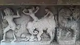 There is a separate shrine for the deity Sarabeswarar,[11] a fusion of man, eagle and lion, who is believed to have relieved the devas (celestial deities) from the fury of Vishnu in the form of Narasimha after he slayed Hiranyakasipu.[5] Sharbeshwaramurti is depicted with six legs, the body and face of a lion, and a tail. It has four human arms, with an axe held in the right upper hand, a noose in the lower right hand, a deer in the upper left hand, and fire in the lower left hand. Narasimha is shown with eight arms, flailing and struggling under Sharbeshwaramurti's feet.[12] The shrine also has sculptures of Sridevi and Bhudevi, the consorts of Vishnu.[5] The bronze image of Sarabheswara temple is believed to be from the period of Kulothunga Chola III.[13]