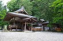 The shrine omits a Honden (main hall) as the mountain behind it is considered the shrine's Shintai.[4][2] It is one of only three major shrines that continue the practice of direct Mountain Worship via Kannabi alongside Ōmiwa Shrine and Suwa-taisha.[6][1] In this case the Kannabi is Mimurogatake, a visible peak of Mount Mitake from the shrine's worship hall.[1]
