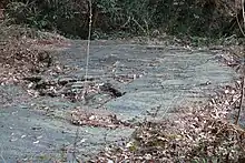 Above the shrine is an expansive slickenslide, a smooth rock surface spanning 9 meters with a 4-meter height, showcases a mirrored finish. Scientists attribute its sheen to the intense friction resulting from the Hachiōji tectonic line's emergence around 100 million years ago. Recognized for its geological significance, this rock was designated a national special natural monument in 1956.[1]