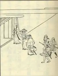 Illustration from Ukiyo Monogatari, showing patrons visiting the licensed prostitution quarter
