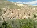 The village exemplifies manmade cliff dwellings which are still inhabited. The troglodyte homes, excavated inside volcanic rocks similar to dwellings in the Turkish region of Cappadocia, are locally called Karaan.[3] Karaans were cut into non-welded ignimbrites, also called "ash-flow tuffs," of Mount Sahand. The cone form of the houses is the result of the erosion of ignimbrite layers consisting of porous, round and angular pumice together with other volcanic particles that were positioned in a grey, acidic matrix. During the eruption of Sahand, pyroclastic flows formed the rocks of Kandovan. Around the village the thickness of this formation exceeds 100 metres (330 ft) and with time, due to water erosion, the cone-shaped cliffs were formed.[4]