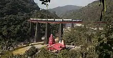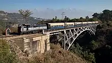 The Kangra Valley Railway is a 2 ft 6 in (762 mm) gauge railway that runs from Pathankot, Punjab to Jogindernagar in Himachal Pradesh. It runs through the sub-Himalayan region of Kangra Valley and is 164 km (101.9 mi) long. It is on the UNESCO World Heritage Sites tentative list.[1] The railway is part of the Firozpur division of Northern Railway. It is the longest Narrow Gauge line in India and also the longest 2 ft 6 in (762 mm) Gauge Railway in the World. The highest point on this line is Ahju station at an elevation of 1,290 meters (4,230 ft). There are 33 stops and 950 bridges.[2]