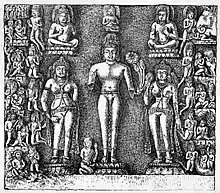 In Cave No.90 is a similar group representing Buddha seated on the Padmasana, on a lotus throne, supported by two figures with snake hoods, and surrounded by attendants in the manner so usual in the Mahayana sculptures of a later age in these caves. There are more figures in this one than are generally found on these compositions, but they are all very like one another in their general characteristics.[13]