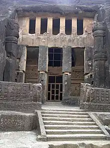 The Kanheri Caves (Kānherī-guhā [kaːnʱeɾiː ɡuɦaː]) are a group of caves and rock-cut monuments cut into a massive basalt outcrop in the forests of the Sanjay Gandhi National Park, on the former island of Salsette in the western outskirts of Mumbai, India. They contain Buddhist sculptures and relief carvings, paintings and inscriptions, dating from the 1st century CE[1] to the 10th century CE. Kanheri comes from the Sanskrit Krishnagiri, which means "black mountain".[2]
