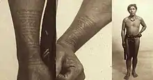 Ancient tattoos can be found among mummified remains of various Cordilleran peoples in cave and hanging coffin burials in northern Luzon, with the oldest surviving examples of which going back to the 13th century. The tattoos on the mummies are often highly individualized, covering the arms of female adults and the whole body of adult males. A 700 to 900-year-old Kankanaey mummy in particular, nicknamed "Apo Anno", had tattoos covering even the soles of the feet and the fingertips. The tattoo patterns are often also carved on the coffins containing the mummies.[17] Tattooing survived up until the mid-20th century, until modernization and conversion to Christianity finally made tattooing traditions extinct among the Kankanaey.[18][19]