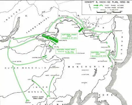 Independently of their yearly planning, the Operations Bureau of the Japanese Army General Staff and the Kwantung Army co-operated in 1938 and 1939 on a pair of related contingencies under the umbrella term "Operational Plan No. 8," or the "Hachi-Go" plan. Both variants, designated Concepts "A" and "B," examined the possibility of an all-out war with the Soviet Union beginning in 1943.[20] Both were far larger than anything previously conceived of by the Japanese: against an expected 60 Soviet divisions, the IJA would commit up to 50 of its own, to be delivered incrementally from China and the Home Islands. Concept A closely mimicked the 1937 war plan by calling for attacks across the eastern and northern borders of Manchuria while maintaining a defensive stance in the west, but the more ambitious Concept B examined the possibility of striking out into the vast steppe between the Great Khingan Mountains and Lake Baikal in the hopes of quickly cutting the Trans-Siberian Railway. Such a move, the Japanese believed, would immediately isolate the whole region from European Russia and doom the remaining defenders to defeat in detail.[21] The scope of operations was enormous: the two sides would be engaged over a front nearly 5,000 kilometers (3,100 miles) in length, with Japan's final objectives being up to 1,200 km (750 mi) deep into Soviet territory. In terms of distances, Concept B would have dwarfed even Operation Barbarossa, the German invasion of the Soviet Union in June 1941.[lower-alpha 3]