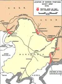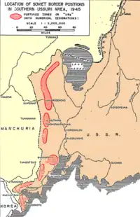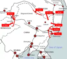 Like the previous concepts drawn up in the aftermath of the Nomonhan Incident, Kantokuen would begin with a massive initial blow on the Ussuri Front against Primorye that would be followed up with another attack to the North against Blagoveshchensk and Kuibyshevka.[45] Under the umbrella organization of the First Area Army, the Japanese Third and Twentieth Armies, supported by the 19th Division of the Korea Army, would penetrate the border south of Lake Khanka to overcome the main Soviet defensive lines and threaten Vladivostok. Simultaneously, the Fifth Army would strike just south of Iman (now Dalnerechensk) to complete the isolation of the Maritime Province, sever the Trans-Siberian Railway, and block any reinforcements arriving from the north. In northern Manchuria, the Fourth Army would at first hold the Amur River line before it transitioned to the offensive against Blagoveshchensk.[46][47] Meanwhile, two reinforced divisions of Japanese troops outside the Kantokuen force structure would start operations against Northern Sakhalin from both the landward and the seaward sides with the aim of wiping out the defenders there in a pincer movement.[48] Other second-stage objectives included the capture of Khabarovsk, Komsomolsk, Skovorodino, Sovetskaya Gavan, and Nikolayevsk. Additionally, amphibious operations against Petropavlovsk-Kamchatsky and other parts of the Kamchatka Peninsula were contemplated.[49][50]