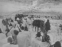 To ensure the success of the first phase of the invasion, enormous forces would be gathered. By 16 September, it was decided that "for operational preparations lasting three months and involving 23 or 24 divisions on the offensive (including the Korea Army)," the logistical basis would be 1,200,000 men, 35,000 motor vehicles, 500 tanks,[lower-alpha 4] 400,000 horses, and 300,000 laborers.[53] That would have meant, however, that the Western Front facing the Mongolian People's Republic and the Trans-Baikal region could be defended by only one division, the 23rd, as well as the equivalent in miscellaneous forces of a few more.[lower-alpha 5] Indeed, during the initial phase of operations, the Japanese Sixth Army was allocated only the 23rd Division and the 8th Border Guards Unit, veterans of the fighting at Khalkhin Gol two years earlier.[55] To minimize the danger from a Soviet counteroffensive in the west while the bulk of the Japanese Army was engaged in the east, the IJA hoped that delaying actions and the vast expanses of the Gobi Desert[56] and Hailar Plain[57] would serve as "strategic buffers" to prevent the Red Army from mounting a serious challenge to the heart of Manchuria before the main body had regrouped for a pivot westward. The final objective of the Japanese troops was a line running through Skovorodino and the western slopes of the Great Khingan Mountains, along which they would defeat the remaining Soviet forces and transition to a defensive stance.[58]