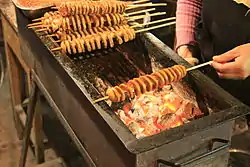 Kaomianjin or roast gluten[1] (simplified Chinese: 烤面筋; traditional Chinese: 烤麵筋) is a type of grilled noodle commonly served in Xi'an, China. Gluten dough, or seitan is shaped into spirals and baked over a barbecue before being sprinkled with spices.[2]