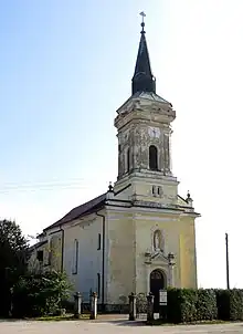 The parish church in the settlement is dedicated to the Assumption of Mary and belongs to the Roman Catholic Diocese of Celje. It was built in 1798 on the site of an earlier building. The belfry dates to 1884. It was badly damaged in the 1895 Ljubljana earthquake and was rebuilt in 1906, when its interior was also decorated with wall paintings.[6] The church was originally Baroque in style and has a richly decorated portal and facade. The nave and chancel are dome-vaulted. In 1901 the church was extended to the west and newly furnished and painted. Part of the baptismal font bearing the year 1601 is preserved.[5]