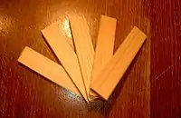 Kapla is a construction set for children and adults. The sets consist only of identical wood planks measuring 11.7 cm x 2.34 cm x 0.78 cm. This 15:3:1 ratio of length:width:thickness is different than the dimensions used for traditionally proportioned building blocks (such as unit blocks), and are used for building features such as lintels, roofs and floors. They are known for their stability in the absence of fastening devices.[1]