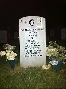 Kareem Rashad Sultan Khan (February 12, 1987 – August 6, 2007) was a United States Army specialist who was killed during Operation Iraqi Freedom.[1] He is a recipient of the Bronze Star and Purple Heart for his service,[1] and is buried in Arlington National Cemetery.[1][2]