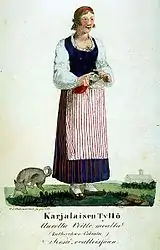 Karelians are known as hospitable and playful; a stereotype in large part created by Zacharias Topelius in his book Maamme kirja (1875). Before this, the stereotype of Karelians described them as close-minded and lazy.[11] Karelia is also often known as the home of poetry[6] and song, which is also reflected in the regional song of Finnish Karelia, Karjalaisten laulu (Song of the Karelians). Karelians have faced multiple hardships in history while developing a strong sense of identity. As a result the evacuations in the 1940s, they also live in a diaspora across Finland. Due these factors, some, such as journalist Ilkka Malmberg and author Heikki Hietamies, have referred to Karelians as the "Jews of Finland".[11][12] A study conducted by Suomen kulttuurirahasto and e2 in 2018 shows that 36% of those identifying as Karelians in Finland are not from Karelia, a percentage way higher than the equivalents with any other heimo. These descendants of the evacuees living in other parts of Finland still hold a connection to the Karelian identity through their families. Being Karelian was also the most popular "secondary heimo identity" in the country, which shows how widespread the Karelian identity is in Finland. Due to this, being Karelian has also been described as first and foremost a mental state.[13] Karelians also often organize different events and celebrations for the Karelian identity, a custom which has become increasingly rare for any other heimo.[14]