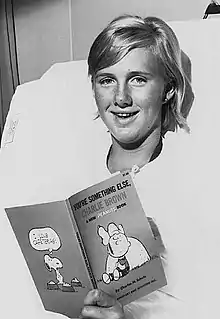 ![]() Budge hospitalized with a dislocated shoulder at the 1968 Winter Olympics, reading a Charlie Brown book by Charles M. Schulz | |