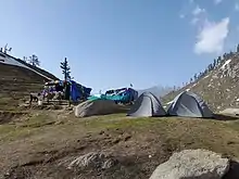 Gaddi Kothi near the lake: The Local Gaddi Tribe graze their cattle in the summer in the vicinity of Kareri and set up temporary shelter under rock caves. In the Winter they trek downhill.