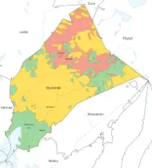 Karjala became an independent parish and municipality in 1906. In the 1960s, it was the least industrialized municipality in Finland Proper, 3/4 of its inhabitants practiced agriculture or forestry.[8] Karjala was consolidated with Mynämäki in 1977.