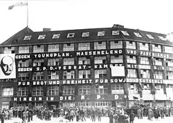 Constructed in 1912 as a factory, the building was purchased by the Communist Party of Germany (Kommunistische Partei Deutschlands, KPD) in 1926. It became the seat of its Central Committee and was named in honor of Karl Liebknecht, the KPD leader who was murdered by a paramilitary unit in January 1919. After Adolf Hitler was appointed as German chancellor, the Berlin police raided the headquarters, and by March 1, the Nazi swastika flag was flying over the building. Renamed the Horst Wessel House, the building at first served as a district police station and detention center in which Jews and political opponents were tortured. In 1935, the finance department of the state of Prussia moved into the building.