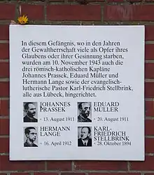 In 1941, while serving as a pastor in Lübeck, he met Johannes Prassek, a Catholic priest from the nearby Sacred Heart Catholic Church (de). They shared their disapproval of the Nazi regime, and Prassek introduced Stellbrink to his Catholic colleagues, Frs Hermann Lange and Eduard Mueller. The four priests spoke publicly against the Nazis – initially discreetly – distributing pamphlets to friends and congregants.[4] They copied and distributed the anti-Nazi sermons of the Catholic Bishop Clemens August von Galen of Münster.[1] Then, following the RAF air raid on the city, after which Stellbrink tended wounded, he delivered a Palm Sunday sermon which attributed the bombing to divine punishment. Stellbrink was arrested, followed by the three Catholic priests. He was sentenced to death by the People’s Court on 23 June 1943, and executed in Hamburg on 10 November 1943, along with the three Catholics.[2] The mingling of the blood of the four guillotined martyrs has become a symbol of German Ecumenism.[4]After his death, Stellbrink's widow was billed for his court costs, imprisonment, and execution.[5]