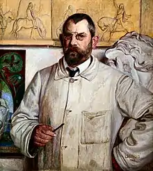After apprenticeships at the Kongelige Porcelainsfabrik and at the Manufacture nationale de Sèvres, he joined Herman A. Kähler at his ceramics factory in Næstved in 1888 where he became artistic director.[1] He produced many successful designs, especially for vases and jugs, often finished in the ruby lustre glaze known as Kähler red.[5] He also decorated a number of buildings, producing friezes for the Aarhus Theatre (1900), Marselisborg (1902) and Ny Carlsberg Glyptotek (1902).[1][6]