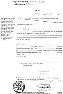 Karl Baer retained the middle initial "M", ostensibly stemming from his birth name, to connect him to his earlier publications under the name "M Baer". In later life he said the letter stood for "Max"; on his gravestone the middle name is given as "Meir". In October 1907 he married Beile Halpern; she died in March 1909, and he remarried, with Elza Max (1887–1947). From 1908 to 1911 Baer was an insurance sales agent; on 1 January 1911 he took up a post as Consul for Jewish Life in Berlin. In December 1920 he became director of the Berlin section of the loge B'nai B'rith, a post he held until the Section's forcible closure by the Gestapo on 19 April 1937.[9] Baer was by then an important figure in Jewish society, and his influence on cultural life brought him into conflict with the Nazi administration. He was allowed to emigrate with his wife in June 1938 to Palestine, later to become Israel, where he worked between 1942 and 1950 as an insurance agent.