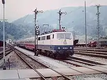 In May 1979 a daily Intercity service from Bremen to Innsbruck named IC Karwendel has been introduced,[3] hauled by DB Class 103 and 111 electric locomotives. On 31 May 1987 it was one of the initial EuroCity services.[4] The EuroCity started as far north as Hamburg but its initial southern terminus Innsbruck was already changed to Seefeld by September 1987 and after only one year as EuroCity the train was reconverted into an Intercity.[5]