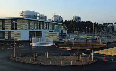 The construction costs of the community centre were around 42 million euros total with a Public-private partnership (PPP) of 25 years with the construction firm Lemminkäinen.[1] The building lies on a seven hectare property and its total area is around 23 000 gross square metres (35 650 071.3 square feet) and floor area measured at 24 588 square metres (264 663.029 square feet).[2] Construction on the community centre began in 2012 and was completed in 2014 when it was handed over for the city's operations and inauguration for the building was held later that year in November. The PPP with the city and the construction firm which includes the maintenance of the building is valid until 2039 and the deals total value is around 86 million euros. The bearing structures of the building are made out of concrete elements and exterior walls from wooden elements with colorful cement bonded fiberboards on top. Parking spaces include 200 parking spots for motor vehicles and 900 bicycle stand spots.