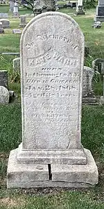 Warne was buried, on January 28, 1868, in the Pinkerton family plot at Graceland Cemetery, Chicago, Illinois.[44][45][8] Her gravestone is marked under the misspelled surname of "Warn",[46] and states that she died of "congestion of the lungs." It was said that she died of pneumonia,[8] and estimated at the age of 35 when she died.[34]