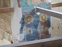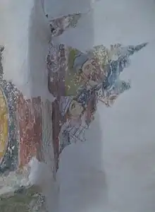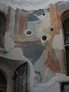 On the opposite apse (a sacristy), John the Baptist’s lifeline is shown. The story is finished with the scenes of his martyrdom and the three findings of his head. Some part of the scene showing Herod's feast is preserved, and the figure of seated Herodias while presented the severed head of the Prophet. Below, one of the 3 findings of the head is shown - the picture of a digging boy's head is preserved. The saint deacons are painted on the entrance arc of the apse.
