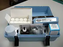Clifford Hach was in charge of research and development while Kitty handled management and marketing.[6][8] Their first successful product was a simplified titration method for measuring hardness in drinking water, which they packaged in easy-to-use testing kits. As municipal standards for drinking water were developed, Kitty recognized both the importance of water plant operators as a market, and the need to work closely with them to develop standards and provide long-term customer service.[8] She developed a direct mail marketing campaign, and earned the nickname "Kitty" Hach by flying her plane across the United States, sometimes landing on rural dirt airstrips in bad weather, delivering water quality testing kits to municipalities of all sizes.[2][5] She became a member of the Ninety-Nines, an international organization of licensed women pilots, and accumulated over 7,000 hours flying time.[10] She was rated for multi-engine and instrument flying.[11]