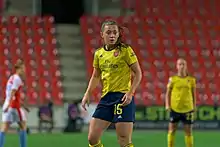She scored 5 goals and picked up 12 assists during the 2020–21 FA WSL season as Arsenal finished in third, tied for first in the league in assists and being named to the PFA Team of the Year.[23] In December 2020, she made her 100th appearance for Arsenal in a 4-0 victory over Everton, picking up an assist from the corner on a goal by Jen Beattie.[24][25] Later that month, she was involved in a COVID-19-related controversy after posting a picture of herself on a beach in Dubai despite a travel ban for Tier 4 residents in London. She stated that she had gone to Dubai for a business meeting with her agent.[26] She did not receive any disciplinary sanctions from the FA for the controversy.[27]
