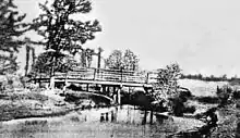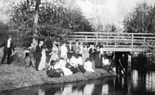In 1845 James J. Crawford received a land grant that included this area. The hot summers and thick clay soil made it difficult to attract settlers to the area.[8] Freed slaves and their families including Thomas (Mary) Robinson and Milto McGinnis, along with Mr. Crawford, Peter Black, and John Sills were the only recorded residents of Cane Island in 1875.