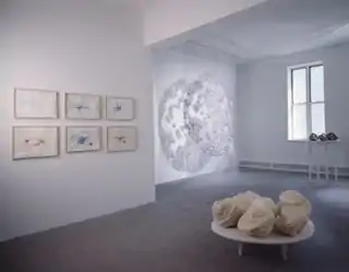 Schimert's work balances a post-minimalist formal concern for object-making, materials and processes with a strong narrative impulse invoking myth, intuition, scientific and social knowledge, and female bodily experience.[18][8][3] According to critics such as Roberta Smith, these elements in conjunction form elusive, sometimes visionary meanings operating "in a skipping, labyrinthine spiral"[1] or "poetic round-robin."[6][2][36] John Yau wrote, "Schimert isn’t satisfied by either an art that is purely visual … or by one that is essentially social in its concerns. The kind of seeing she is after connects looking outward with looking inward, the gaze merged with reflection."[3] Writers often cite the dynamic, varied topographies of her drawings as the fullest expression of the complexities and possibilities in her work.[37][38][2][7] Critics such as Jan Avgikos and Ronald Jones placed Schimert's mid-1990s work amid a sensibility Avgikos termed "retro-Romantic," which emphasized elaborate narratives, "objecthood" and social themes over the era's didactic, theory-laden approach.[5][39][29] They connected her work to contemporaries Matthew Barney and Cindy Sherman, as well as to Symbolists such as Odilon Redon.[5][39][25][1]