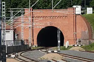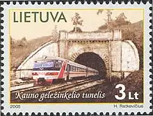 Kaunas railway tunnel (Lithuanian: Kauno geležinkelio tunelis) is one of the two railway tunnels existing in Lithuania and the only railway tunnel operating in the Baltic states. Passenger trains are operating between Vilnius and Kaunas through this tunnel. The length of the tunnel is 1,285 metres (0,803 miles), height – 6,6 metres, width – 8,8 metres. Kaunas railway tunnel was included into the Registry of Immovable Cultural Heritage Sites of the Republic of Lithuania in 1996.[1]