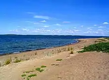 Kaunissaari forms part of an esker that juts out into the Gulf of Finland. The soil also has a glacial till on the west side of the ridge formation. The trees are mainly pines; the southern part of the island has culturally influenced, lush vegetation, and much deciduous trees.[2] Sand beaches are located on the north and east side of the island.[1] At the southern end of Kaunissaari is a fishing village, the oldest buildings of which are from the 19th century, although the earliest records of Kaunissaari's settlement date from the 1560s.[3] Of these, the old fishing village and the island's sandy beaches make the island a popular excursion destination, which is why Kaunissaari is the most popular seaside tourist destination in Kymenlaakso and the most versatile archipelago destination in terms of service equipment.[4] Tourists and villagers in Kaunissaari are served by a retail store, restaurant and café opened in the 1980s and an archipelago museum, which presents the local history of the island.[1][5] Kaunissaari holiday village offers accommodation in log cabins, and the old school building can also be rented for small groups.[5] The current guest marina was built in the early 1990s because the old one became congested due to tourism.[3]