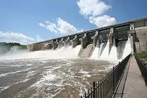 The Oklahoma Municipal Power Authority (OMPA), a state governmental agency created in 1981 to provide wholesale electricity to cities and towns in Oklahoma,[5] purchased the substructure of the dam in July 1987 at a cost of $3.8 million and constructed a hydroelectric plant that was completed in September 1989 at a cost of $25 million. Kaw Hydroelectric generates approximately 104 gigawatt hours of energy annually. The generator is nominally rated at 25.6 megawatts at 76 feet (23 m) of gross head with a maximum rating of 36.7 MVA.[2] The plant at Kaw Dam provides power for over 35 municipal electrical systems in Oklahoma and southern Kansas. The project engineer for the Kaw Lake dam was Everette W. Woodham, Jr.[4]