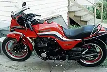 The Kawasaki GPz750 was a sport bike introduced by Kawasaki in 1982. In comparison with the KZ750, it had many updates focusing on high performance . Changes started at the front, with tapered bearings in the steering head instead of the KZ750's ball bearings, and the upper triple clamp was changed also, giving the GPz solid aluminum clip-on handle grips instead of the traditional handlebar. A bikini fairing almost identical to the one on the GPz550 was added too. The GPz750 had increased power, with slightly higher compression, and camshafts designed to get the valves to full lift quicker, and fitting Mikuni 34mm carburetors for smoother airflow. The cylinder heads were also given a new combustion chamber, and porting and polishing from the factory. An oil-cooler was also added. The GPz750 was the quickest factory 750, as Cycle World recorded a time of 11.93 seconds at 109.62 mph (176.42 km/h) in the 1/4 mile.[1] The GPz750 underwent some significant changes in 1983. The original was based on the 1981 KZ750-E.[2] Kawasaki retired the KZ750 after 1983. The 1983 KZ750L3 was nearly identical to the '82 GPz750, but for different colors, no bikini fairing, and without the porting & polishing in the cylinder head.[3]