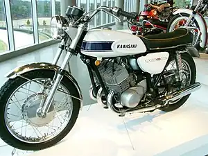 The goal was to produce a motorcycle with 500 cc displacement that was able to develop 60 hp and have 13-second quarter-mile times, then considered over the achievable limit for a road bike.[2] When announced, the H1 was critiqued in UK motorcycling press for their "own ambitious claim" of "the fastest and best accelerating road machine ever produced, being capable of 124 mph and 12.4 sec. [sic] for the standing start quarter mile".[3] Cycle World's 1969 test quoted 119.14 mph and 13.20 seconds,[4] with bike-retailer Reads of London at 109 and 13.5, whereas Dutch motorcycle drag racer Henk Vink, importer of Kawasakis into the Netherlands, was quoted as achieving 13.48.[5]