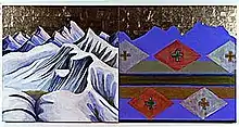 She began making abstract/landscape diptychs in 1985,[5][9] for which she gained success nationally and internationally.[6] Generally, she made an abstract work on one panel of the diptych and a representational, or realistic, image on the other. She has made landscapes of the Rockies and the Alps and of the ancient southwestern sites, Mesa Verde and Canyon De Chelly from sketches she had made during her visits there.[13] Walkingstick said, "I do not see my paintings as landscapes, per se, but rather as paintings that describe two kinds of perception of the earth. One view is visual and fleeting and the other is abstract and everlasting. These paintings are my attempt to express the mythically inexpressible and to unify the present with eternity."[14]