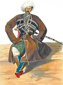 Kazi-Beg's son Gabriel was made an aznauri, noble of a lower rank, and adopted the surname Kazbegi (Kazbek). He played a role in the Russian-Georgian interaction and pledged his loyalty to the Russians upon their annexation of Georgia in 1801. When the Georgian princes of the deposed Bagrationi dynasty rallied Georgian and Ossetian highlanders against the Tsar's rule in 1804, Gabriel Kazbegi fought in the Russian ranks and was promoted to major. The clan ran Stepan-Tsminda – henceforth frequently referred to as Kazbek in Russian accounts – and Khevi as their fief. Gabriel's son Mikheil (1805—1876) fought in the Caucasian War and was made a major general of the Russian army in 1859. Mikheil's son was the famed Georgian prose writer Alexander Kazbegi.[2][3]