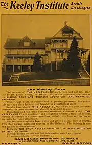 The Keeley Institute eventually had over 200 branches throughout the United States and Europe, and by 1900 the so-called Keeley Cure, injections of bichloride of gold, had been administered to more than 300,000 people.[3] The reputation of the Keeley Cure was largely enhanced by positive coverage from the Chicago Tribune.[3] The New York Times also featured coverage on the Keeley Institute as early as 1891, and in 1893 a Brooklyn man's drunken rabble-rousing received coverage which noted he was a Keeley Institute graduate. The Times said "it is not everyday that a man from the Keeley Institute for the cure of drunkenness comes to New-York and gets into such a predicament."[4][5]