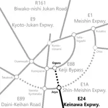 The Keinawa Expressway (京奈和自動車道, Keinawa jidōsha-dō) is a 104.9-km-long (65.2 mile) north–south (physically northeast–southwest) National Highway with access control (一般国道自動車専用道路 Ippan-kokudō jidōsha-sen-yō-dōro) in the Kinki region of Japan that connects Kyoto Prefecture to Wakayama Prefecture via Nara Prefecture. It is numbered "E24" under Ministry of Land, Infrastructure, Transport and Tourism's "Expressway Numbering Systemg."[1]