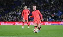 Walsh missed the start of Barcelona's 2023–24 season with a lengthy injury, returning in October 2023.[204][205] Used as a substitute attacking midfielder in her first match back, she provided an assist within minutes of entering the pitch.[206][207] She then had a successful start to her season, excelling in her role as pivot and regularly making the team of the week,[208][209][n 4] before scoring in consecutive games in Barcelona's last two games of 2023. She scored the only open play goal in a 2–0 Liga F win and the opener in a 7–0 Champions League group stage victory, her first Champions League goal for the club, both from inside the area: El Periódico said of the first that Walsh must have "chased away some of the demons that accompanied her every time she approached the area."[214][215]