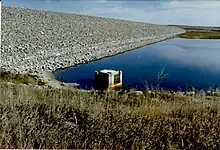 Norton Dam is a zoned earth-fill embankment dam with rock riprap on its upstream face.[6] It has a structural height of 151 feet (46 m) and a length of 6,450 feet (1,970 m). At its crest, the dam has an elevation of 2,347 feet (715 m).[13] A spillway structure controlled by three radial gates is located at the southeast end of the dam. Outlet works at the northwest end of the dam manage outflow into Prairie Dog Creek and the city of Norton's municipal water supply.[6]