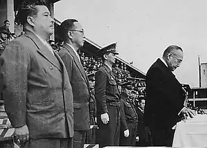 By the end of the 1950s, Japan had already become an important ally in the Western defense system as dominated by the US.[62] To foster closer ties with other allies of the US, Hayashi paid several visits to some of these countries.[56] In particular, he paid a visit to the United Kingdom (UK) under the invitation of the British government from 5 to 16 May 1957, during which he visited the British Armed Forces and their facilities in London and other places.[63] It was the first formal visit of a senior Japanese general officer to the UK since 1937, when Lieutenant-General Masaharu Homma attended the coronation ceremony of King George VI.[64] After visiting the UK, Hayashi arrived at Bonn, West Germany on 21 May 1957. On the following day, he met Franz Josef Strauss, Federal Minister of Defense, and Generalleutnant Adolf Heusinger, Inspector General of the Bundeswehr.[65][66] It was the first post-war meeting between military chiefs of Japan and Germany and they achieved productive agreements on building a military exchange mechanism.[67] On 14 and 15 November 1959, Hayashi attended a multinational military conference as hosted by Admiral Harry D. Felt, Commander of the US Pacific Command, at Baguio, the Philippines.[68][69] During his stay, he met Lieutenant-General Manuel F. Cabal, Chief of Staff of the Philippines, General Peng Meng-chi, Chief of the General Staff of the Republic of China, as well as other military chiefs from member states of the Southeast Asia Treaty Organization with a view to fostering stronger military ties with countries in the Western Pacific Region.[68][70][69]