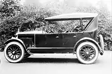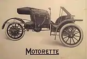 Carl Kelsey designed an automobile that would be less expensive than the Model T. Introduced in September 1910, the three-wheel vehicle was the Motorette, built in Hartford, Connecticut. The Motorette (a name that he trademarked),[1] was rear-wheel driven by a two-stroke, twin-cylinder engine which was air-cooled on early models.[1][2] Later models were water-cooled, with the radiator mounted behind the engine.[2][1]