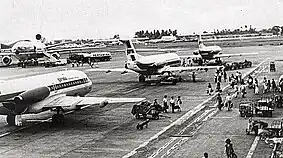Douglas DC-8 jetliners flown by Garuda Indonesia, KLM, Japan Airlines, UTA French Airlines, Air Ceylon and Thai Airways operated to Kemayoran in the 1960s and early 1970s, as did Cathay Pacific Convair 880 jets. Paris-based Transports Aeriens Intercontinentaux formerly served Kemayoran with DC-8s prior to being merged into UTA. Garuda Indonesia also flew Convair 990 and Douglas DC-9 jets as well as Fokker F27 turboprops into the airport at this time. Boeing 707 jetliners operated by Air India, Malaysia-Singapore Airlines, Pan Am and Qantas served Kemayoran as well.