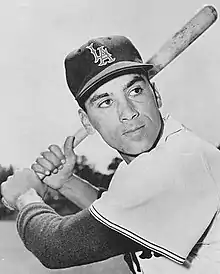 He was the starting second baseman in the Angels' first-ever American League game on April 11, 1961, against the Baltimore Orioles. Batting second in the lineup behind Eddie Yost, Aspromonte went one-for-four at the plate, making one error in eight chances in the field, as Los Angeles won, 7–2.[1] But Aspromonte struggled at the bat through the season's early weeks, and was hitting only .223 when he was placed on waivers and claimed by his old team, the Indians, on July 3. Relegated to a utility role, he played in only 42 games over a full calendar year for Cleveland. Then his contract was sold to the Braves, where Aspromonte backed up second baseman Frank Bolling and third baseman Eddie Mathews for the remainder of 1962. The Cubs acquired him in a midwinter deal, but he collected only five hits in 34 at bats in a utility role during the first two months of the 1963 campaign, and he was sent to the Pacific Coast League, where he finished his U.S. pro career. As a big-leaguer, he appeared in 475 games; his 369 hits included 69 doubles, three triples and 19 home runs.