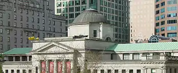 Lum has worked on several public art projects. In Vienna in 2000, Lum realized a 540 square metre work on the side of the centrally located Kunsthalle Wien for the non-profit art initiative museum in progress.[38] The work, There is no place like home, generated controversy as Lum saw the work as a response to the growth of the extreme right in Europe. Lum's Four Boats Stranded: Red and Yellow, Black and White was installed upon the roof of the Vancouver Art Gallery in 2001.[39] The work, which can be viewed as a comment on immigration and acculturation, features four model boats: a First Nations longboat, a cargo ship, the steam liner Komagata Maru, and George Vancouver's ship HMS Discovery. Each vessel has been placed at one of the building's compass points—north, south, east, and west—and painted in a colour intended to reflect the stereotyped racial vision presented in the hymn "Jesus Loves the Little Children".[40]