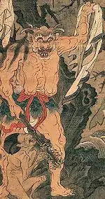 Keneō (懸衣翁) is a Japanese Oni who sits at the edge of the Sanzu River in the Buddhist underworld. His name translates to clothes hanging old man. In Japanese tradition when someone dies 6 mon, an old form of currency, are placed with the body to be used as payment to enter the underworld. When a soul of an adult arrives at the river they are supposed to cross it. If they were good in their lifetime they are allowed to cross the bridge. If they were partially good they have to wade through the shallow section of the river. If they were bad during their life they are forced to swim across the deepest part of the river. Once the adult soul arrives at the river Datsue-ba forces the sinners to take off their clothes, and Keneō hangs these clothes on a riverside branch that bends to reflect the gravity of the sins. If a soul arrives without clothes, Keneō flays the person’s skin and hangs it from the tree instead. The souls that are worse in life have clothes that weigh down the branch more because they carry more water from having to swim across the river.[1] Various levels of punishment are then performed by the pair. For those who steal, for example, Datsue-ba breaks their fingers, and together with Keneō, she ties the sinner's head to the sinner's feet.[2] Keneō and Datsue-Ba also walk along the edge of the river and torment the souls of children that are too young to cross the river.